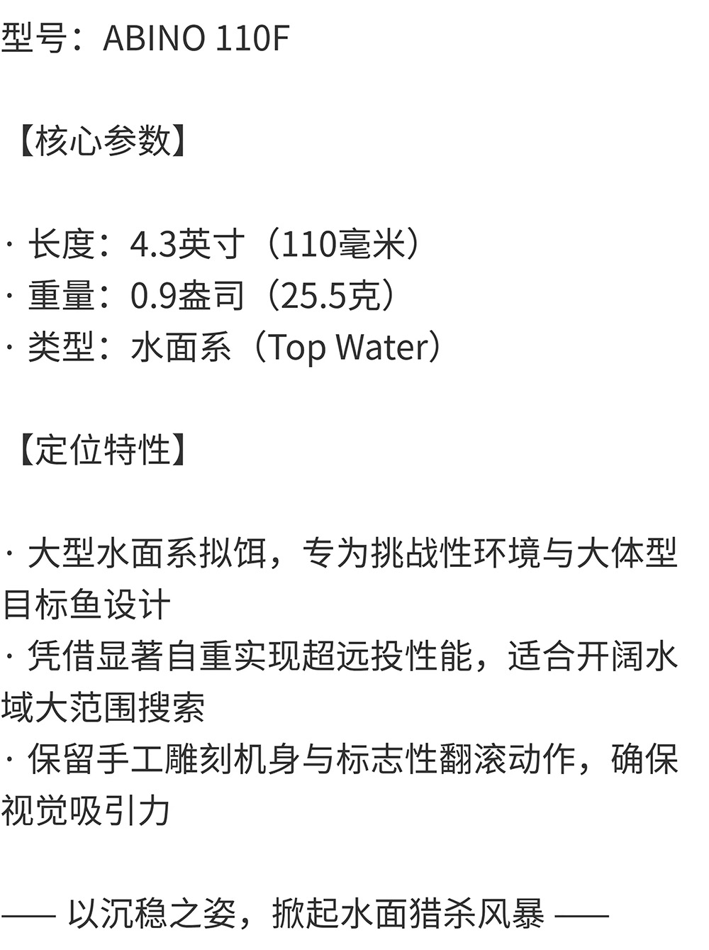 日本进口Nishine路亚饵Abino 110F水面系唤醒饵