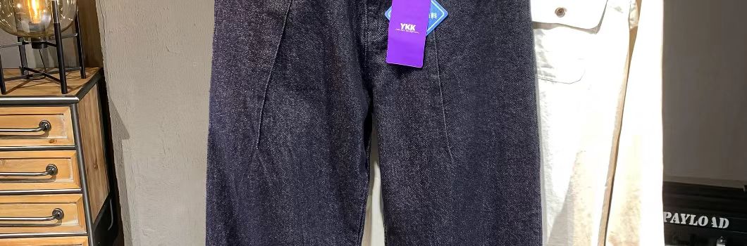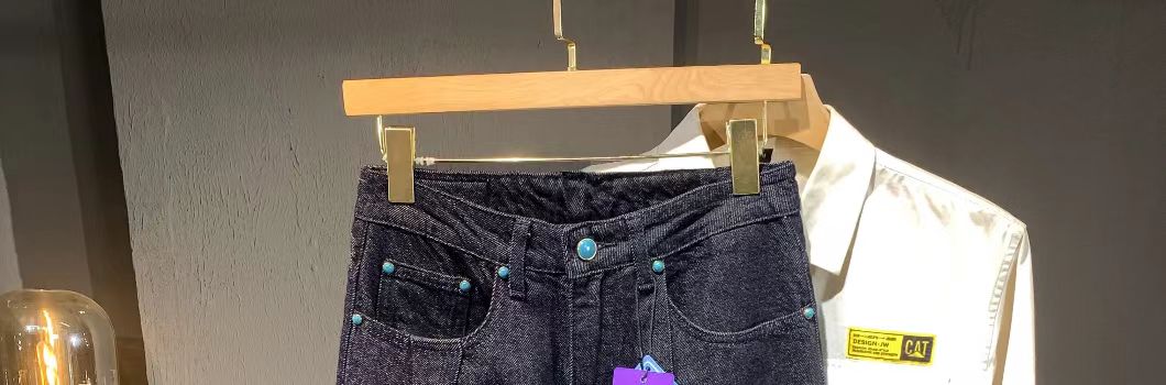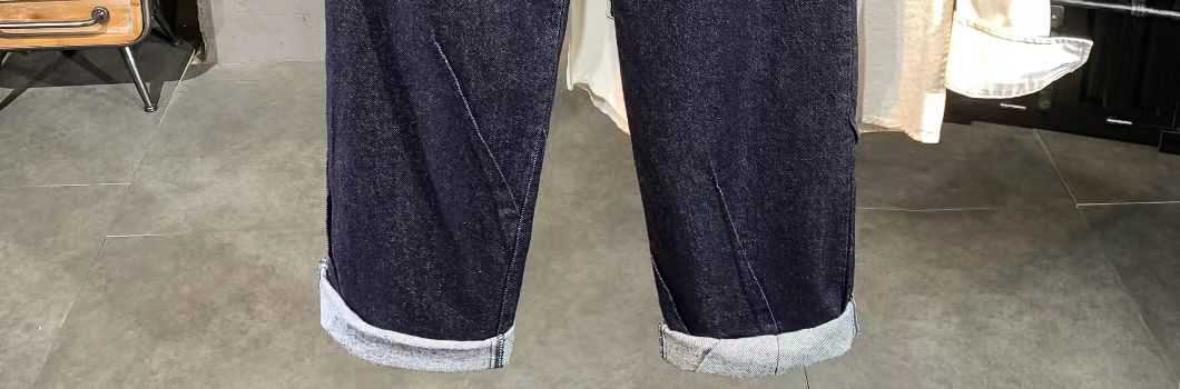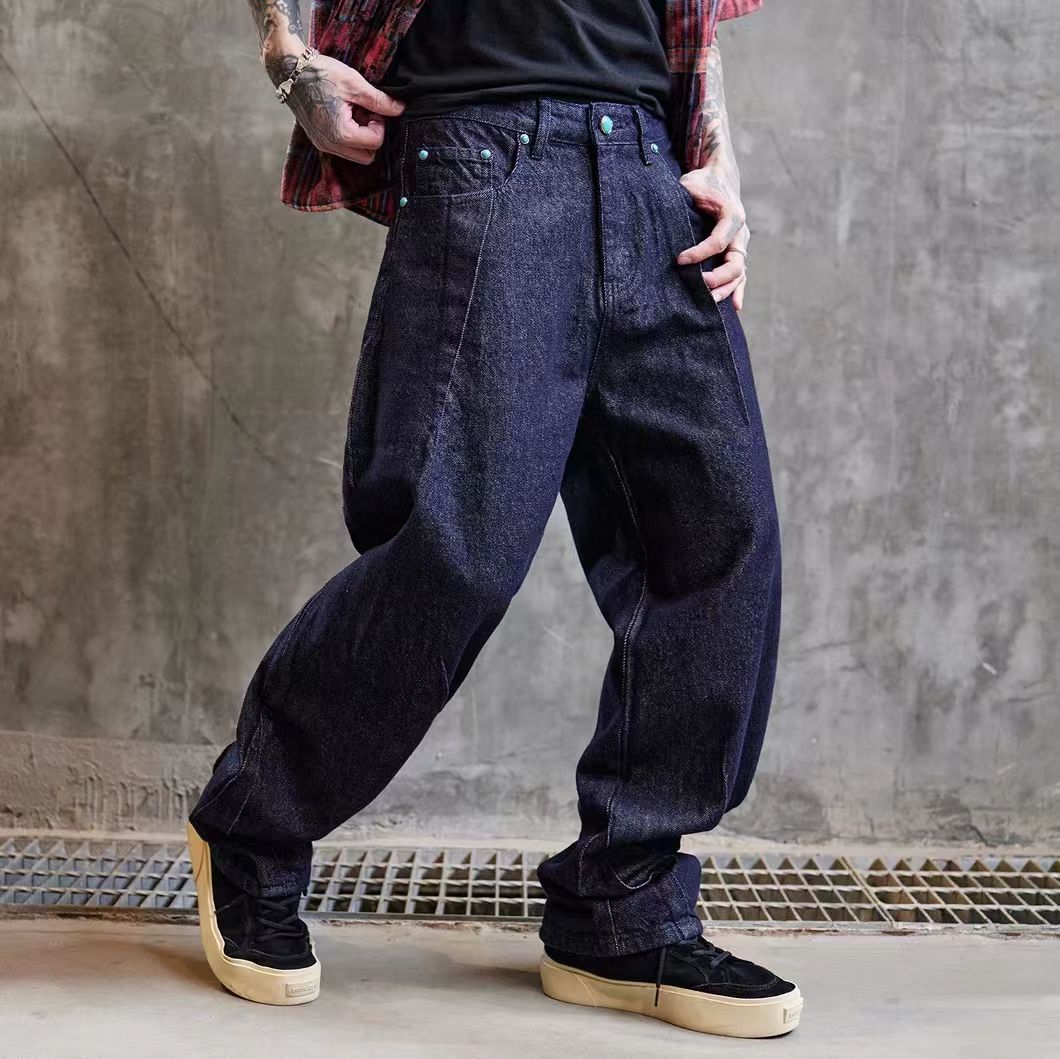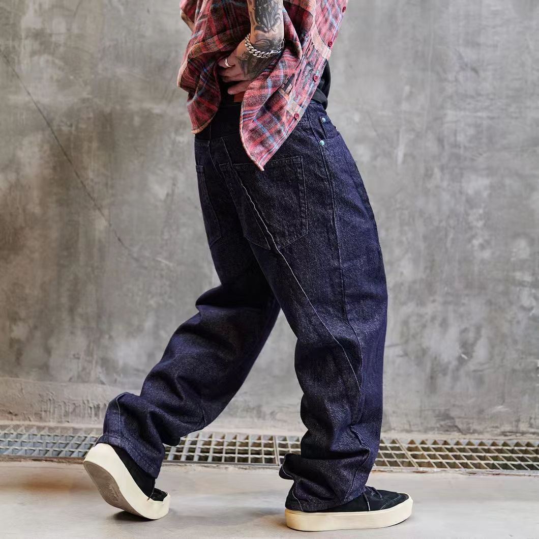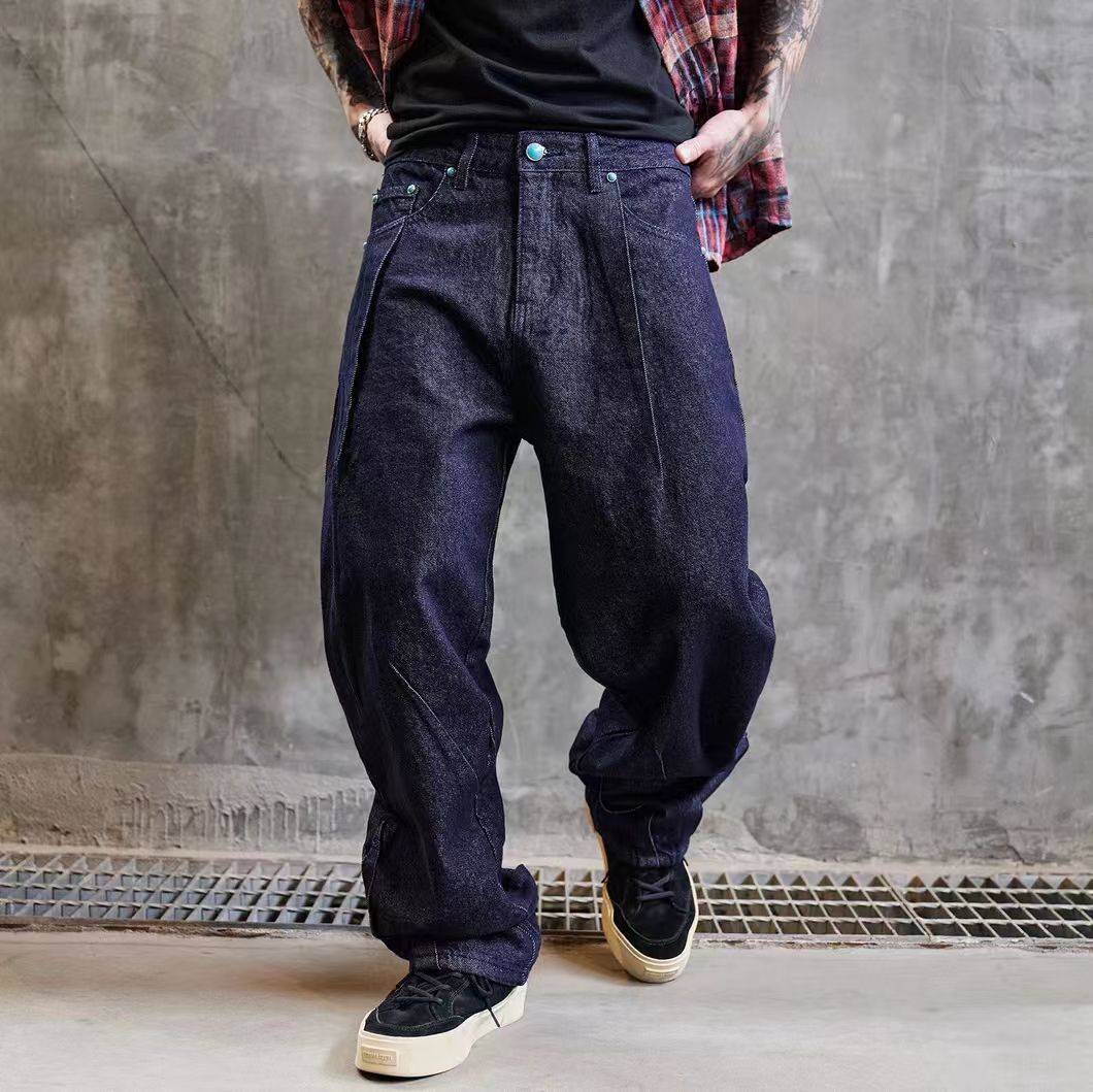 海淘水洗原色褶皱设计宽松牛仔裤